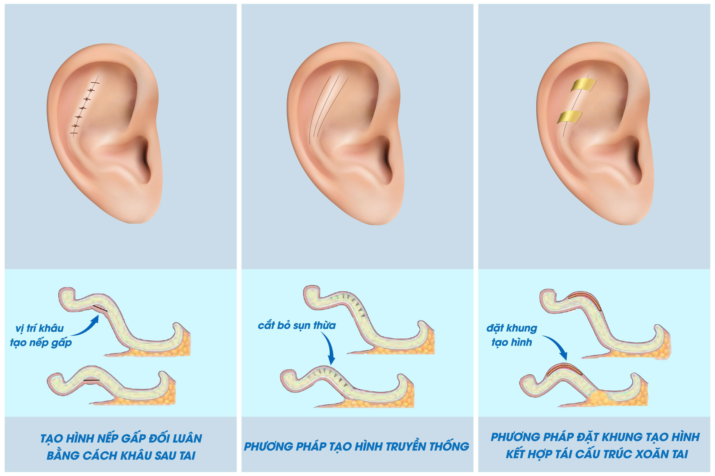 1. Tạo hình nếp gấp đối luân bằng cách khâu sau tai: Bác sĩ sử dụng chỉ khâu để tạo nếp gấp tự nhiên cho tai. Đây là phương pháp dễ thực hiện nhất và thời gian phục hồi tương đối nhanh. Tuy nhiên, hiệu quả có thể không lâu dài do chỉ khâu có thể chùng lỏng theo thời gian, dẫn đến nguy cơ tai vểnh tái phát và cần can thiệp lại.